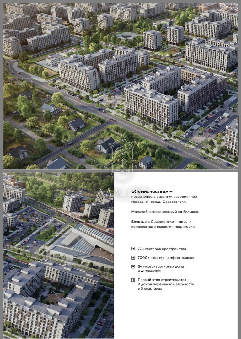 Семисчастье — это место, где каждое мгновение имеет значение. Первый проект подобного масштаба в Севастополе: Амбициозный проект комплексного развития территории в районе 7 километра Балаклавского шоссе. Это район, вдохновляющий своим размахом. 70 гектаров территории. 7 000 квартир комфорт-класса. 54 многоквартирных дома и 41 таунхаус. 3 жилых квартала в 1 этапе строительства — 9 домов переменной этажности. Пространство для жизни с комфортом и смыслом: «Семисчастье» — полноценный район, созданный для жизни, развития и отдыха. 4 современных детских сада и школа. Поликлиника. Торговый центр. Физкультурно- оздоровительный комплекс. Коммерческие помещения для бизнеса. Аптеки, магазины и любимые кафе — в шаговой доступности. Комфорт, продуманный до мелочей. Безусловные преимущества: Приватные дворы без машин. Соседский центр. Дизайнерские холлы. Сквозные парадные и бесшумные лифты. Ландшафтное озеленение с автополивом. Современные детские игровые площадки. Велодорожки, удобные парковки. Пространства для семейного отдыха. Безбарьерная среда для маломобильных жителей. Кладовые для сезонных вещей. Собственная котельная- энергоэффективность и надежность. Уникальные общественные пространства: Пешеходный бульвар с зонами отдыха. Просторная городская площадь. Зеленый сквер и места для прогулок. 35% территории — озеленение. Проект представлен на Всероссийской «зелёной» конференции как образцовый пример устойчивого градостроительства. Современная архитектура. Керамогранитные вентилируемые фасады- долговечность и терморегуляция. Архитектурная подсветка фасадов. Выразительный облик комплекса. Широкий выбор квартир, созданных для самых разных предпочтений и образа жизни: Студии от 31,9 до 37,50 м 2. 1- комнатные — от 33,7 до 58,3 м². 2- комнатные — от 57 до 79 м². 3- комнатные — от 78 до 140 м². 4- комнатные — 118 м². Дополняет разнообразие планировок евроформат, который сочетает современные решения с эргономикой. Квартиры сдаются в предчистовой отделке White Box — Вам остается только внести финальные штрихи по своему вкусу. Каждая квартира с застеклённой лоджией. Уникальные решения: Верхние этажи — с открытыми террасами. Первый этаж- двухуровневые квартиры с собственным выходом. Транспортная доступность. Расстояние на автомобиле до важнейших точек Севастополя: Набережная Балаклавы — 10 минут. Центр Севастополя и Новый Херсонес — 20 минут. Ж/Д и автовокзалы — 15 минут. ТЦ «Sea Mall» — 5 минут. ТЦ «Муссон» — 20 минут. Доступна ипотека в банках: Втб, Сбер, генбанк, АБ Россия. Все ипотеки по гос. Программам. Рассрочка от застройщика: ПВ 50%, остальная сумма выплачивается равными платежами ежемесячно или ежеквартально до 1 квартала 2028. Сдача объекта — 4 кв. 2028 года. Застройщик ООО " СЗ "Корабельный" Инн 9201527876, адрес г. Севастополь, ул. Хрусталева, д. 84 каб.7. Проектная декларация размещена на сайте Еисжс https: //наш. Дом. Рф/.