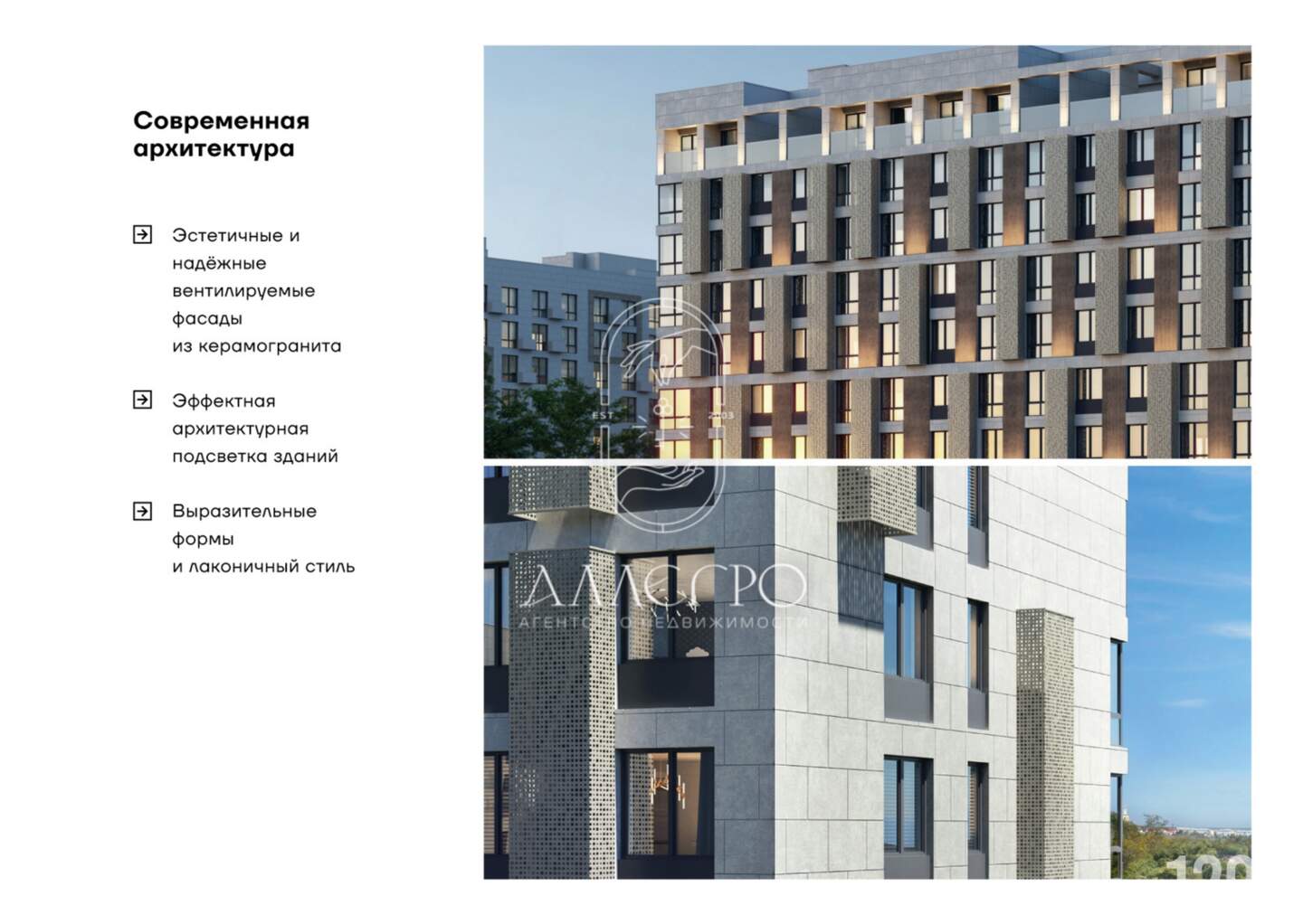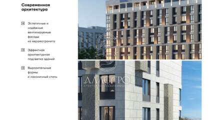 Дома с вентилируемыми фасадами из керамогранита с архитектурной подсветкой.